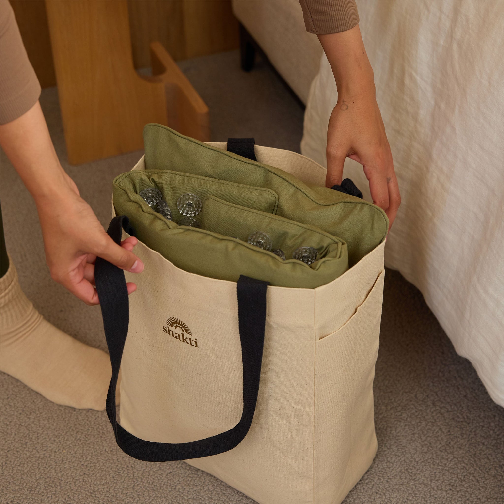 With dual carry handles (hand and shoulder) and external bottle-sized pockets, it’s made to move through your day with you. Toss in your Shakti essentials, a supermarket shop, or your daily goodies and you're good to go.