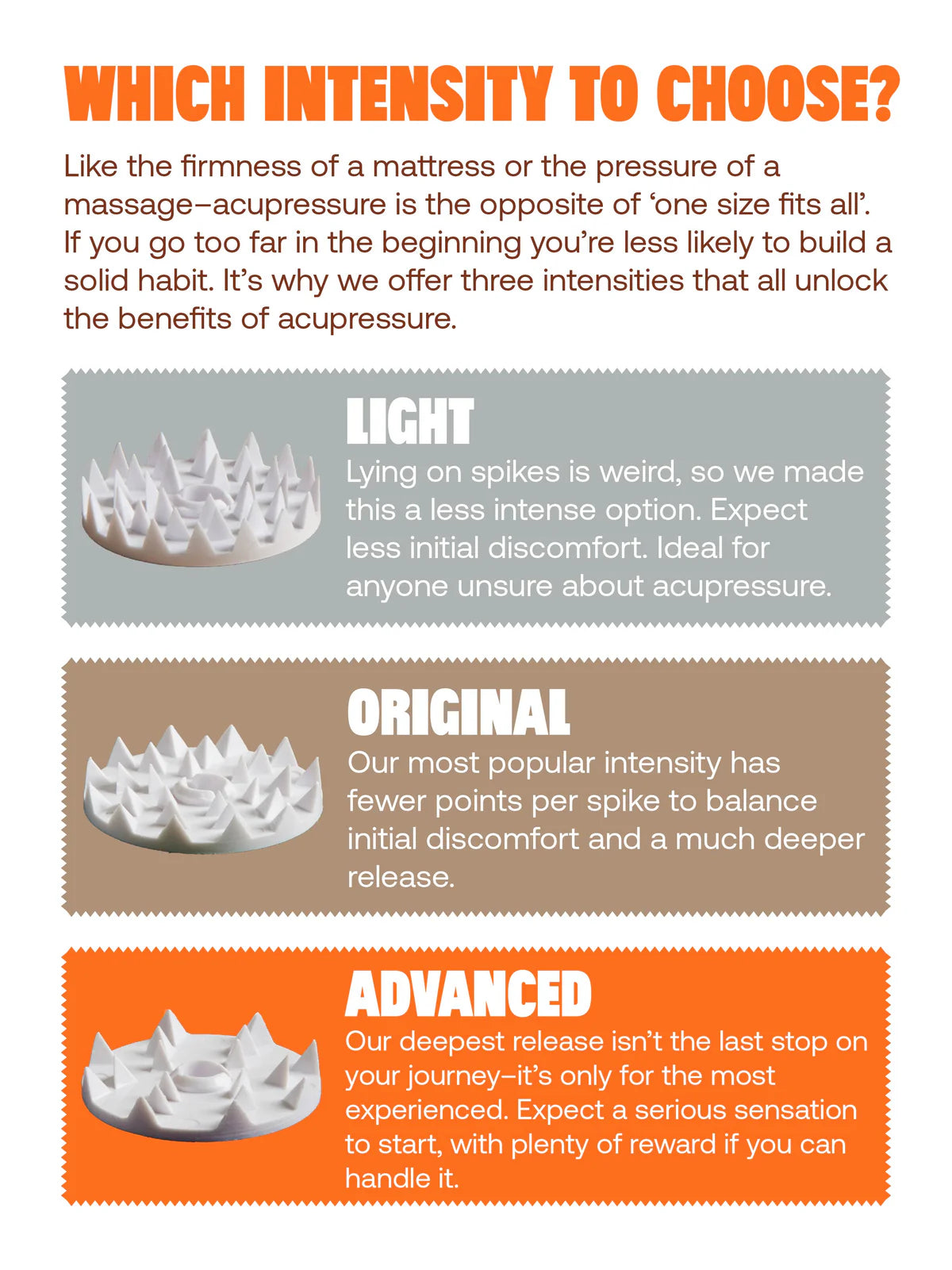 Lying on spikes is weird, so we made sure this is the perfect place to start. Expect a balance of initial discomfort and deep release. Ideal for anyone new to acupressure.Original